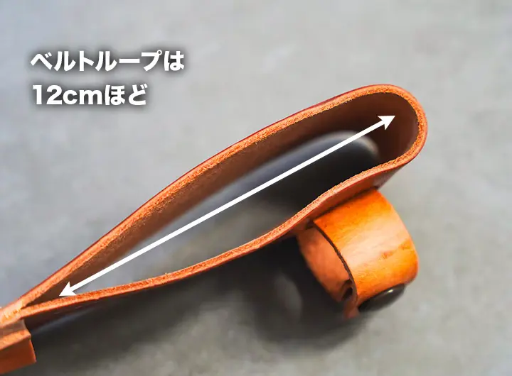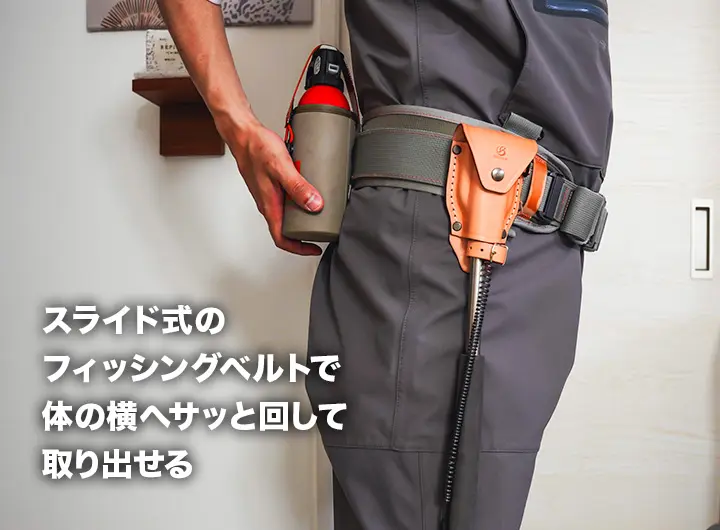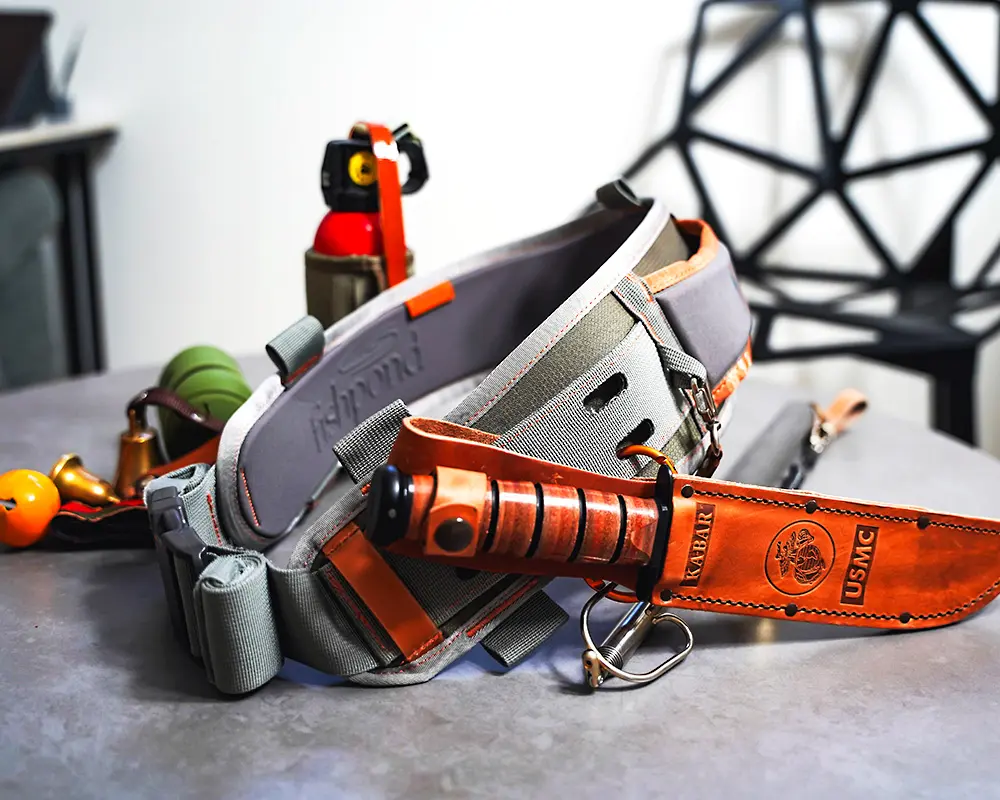 筆者はベルトに取り付けています。FishPond製品がアッシュグリーンをベースに、赤茶の革やオレンジ色がキーカラーなので、ナイフのシースケースも色合わせしたいと考えていました。