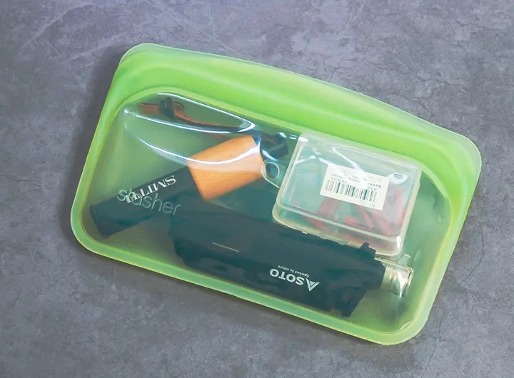 1本ずつバラした爆竹はプラケースに入れて保管します。プラケースは釣具屋で50円〜100円で売ってます。爆竹は水や湿気に弱いため、防水ケース「STASHER(スタッシャー)」に入れて持ち歩いています。