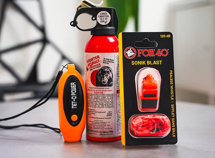 笛や鈴など音による対策は一般的ですが、匂いによる対策も効果的のようです。最終手段として護身用ナイフも。