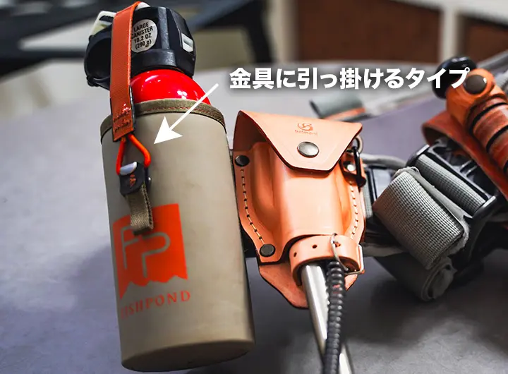 筆者は装備のほとんどをフィッシュポンド製品で揃えていることもありますが、フィッシュポンドの熊スプレー用ケースはマジックテープではなく、金具に引っ掛けるタイプ。幸いにも音はなりません。サイズもカウンターアサルトにピッタリ。伸縮性があるため、CA230/CA290どちらも収納できます。