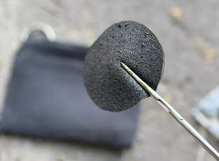 透明な袋から忌避剤を取り出し、黒い網袋に入れます。網袋をフィッシングベストやバッグ、ベルトにつけて利用します。