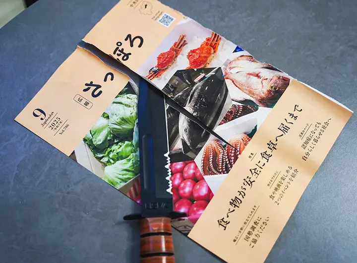 KA-BAR1218は切れ味もGoodです。厚紙のカットはもちろん、逆にこんなに薄いペラペラの紙もまるでカッターのようにスパッと切れたことに驚きました。札幌の広報誌に犠牲になってもらいましたが、切れ味はバッチリです。