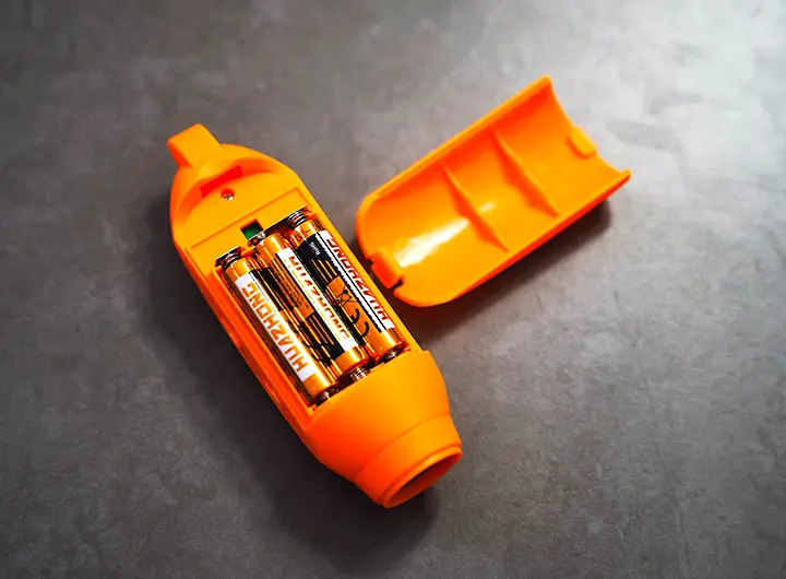 この電子ホイッスルは単4電池3本で動きます。生活防水仕様で突然の雨も安心。筆者は先日川で少し流されかけ、ウェーダー内も浸水し全身ずぶ濡れ状態(夏で良かった)になりました。電子ホイッスルも壊れたと思いましたが、生活防水の範囲内だったのか、その後も普通に使えました。