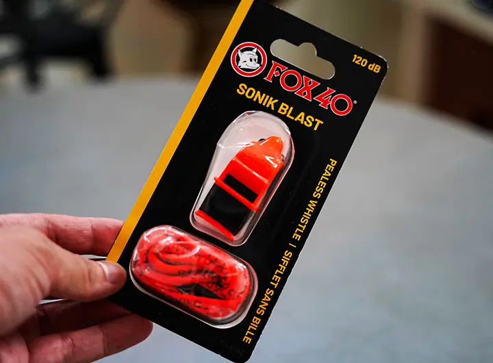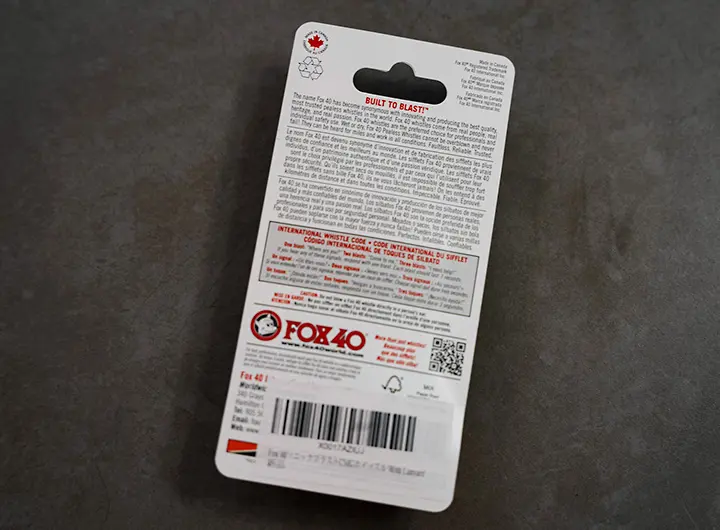国産メーカーの色々なホイッスルを試したけれど、FOX40 ソニックブラストの爆音の前ではどれも霞んでしまいます。音量はなんと120db超のホイッスルです。1マイル(1.6km)以上離れた場所でも聞こえるそうです。