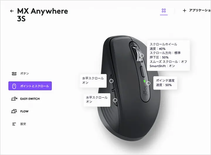 スクロール速度やカスタムボタンの割り当ては、専用アプリの「Logi Options+」で設定します。