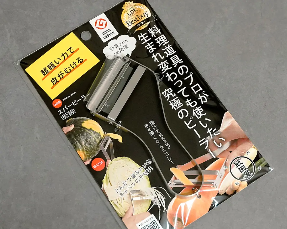 2020年 GOOD DESIGN AWARDも受賞した飯田屋のエバーピーラー。右利き用、左利き用がラインナップされ、切れ味の良さ以外にも、握りやすいグリップ形状や40gという軽さなど、実用的で機能的なデザインにもこだわりのある製品です。