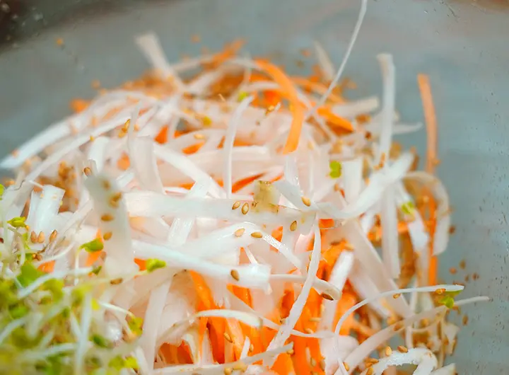 ささがきにしたゴボウを5〜10分、水にさらしアクを抜きます。千切りにしたにんじんとゴボウ、お好みで葉物をボウルに入れ、【A】のドレッシングを絡めます。最後に白ごまを適量ふりかけて出来上がり