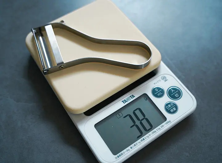 エバーピーラーの実際の使い心地についてレビューします。通常サイズのエバーピーラーの重さは約40g、実測値38gでした。大きさの割に軽く感じました。大きくて重くて使い難い、疲れるということはないです。