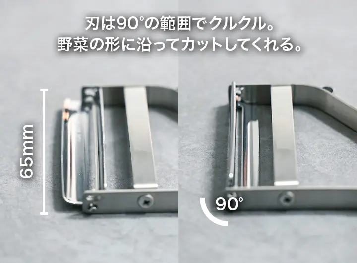 通常サイズのエバーピーラーの刃は幅65mmです。キャベツやカボチャなど大きな野菜もカットしやすい幅です。刃部分は野菜の形に合わせてクルクルしてくれるので、なめらかにカットしてくれます。