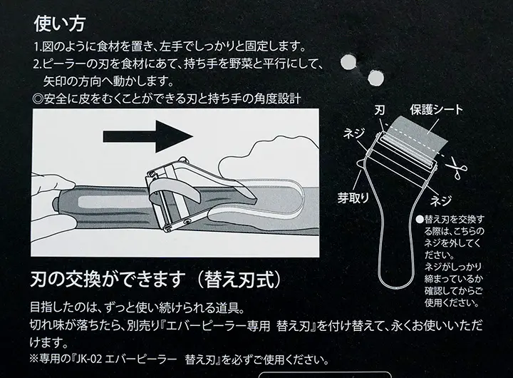 エバーピーラーは、日本三大刃物の産地 岐阜県関市で刃付けされたMADE IN JAPANのピーラーです。一生モノの料理道具を目指して設計されたエバーピーラーは、刃が鈍ってきたら交換できる替刃式。本体を買い直す必要がありません。替え刃はamazonで通常サイズ990円でした。通常サイズとミニで替え刃のサイズは異なるので、購入時は間違わないように。